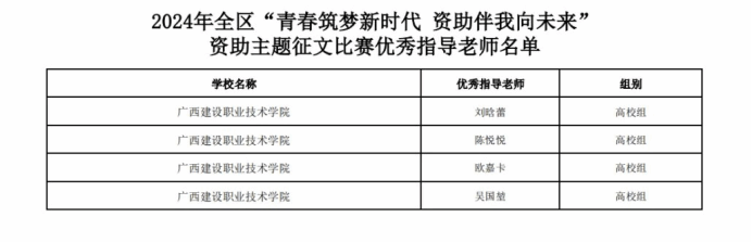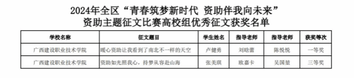 伟德国际1946源于英国10月20日讯(文/杨栋)近日,自治区教育厅公布2024年全区“青春筑梦新时代 资助伴我向未来”资助主题征文比赛获奖名单,伟德国际官网选送的两个作品分别荣获一等奖和三等奖,指导老师获评优秀指导老师。