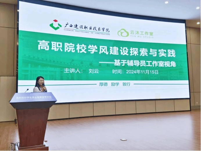 伟德国际1946源于英国11月18日讯(文/建筑与规划学院 刘云 图/云沐工作室)11月15日上午,2024年高职院校学生学业发展指导论坛在广西生态工程职业技术学院举办。本次论坛以学业指导工作专业化发展为主题,邀请来自北京、浙江、广西等全国多所院校学业指导领域的专家学者和一线教师采用线上线下相结合的方式进行经验分享和探讨交流。伟德国际官网建筑与规划学院团总支书记、云沐工作室主持人刘云受邀在论坛上作主题报告。