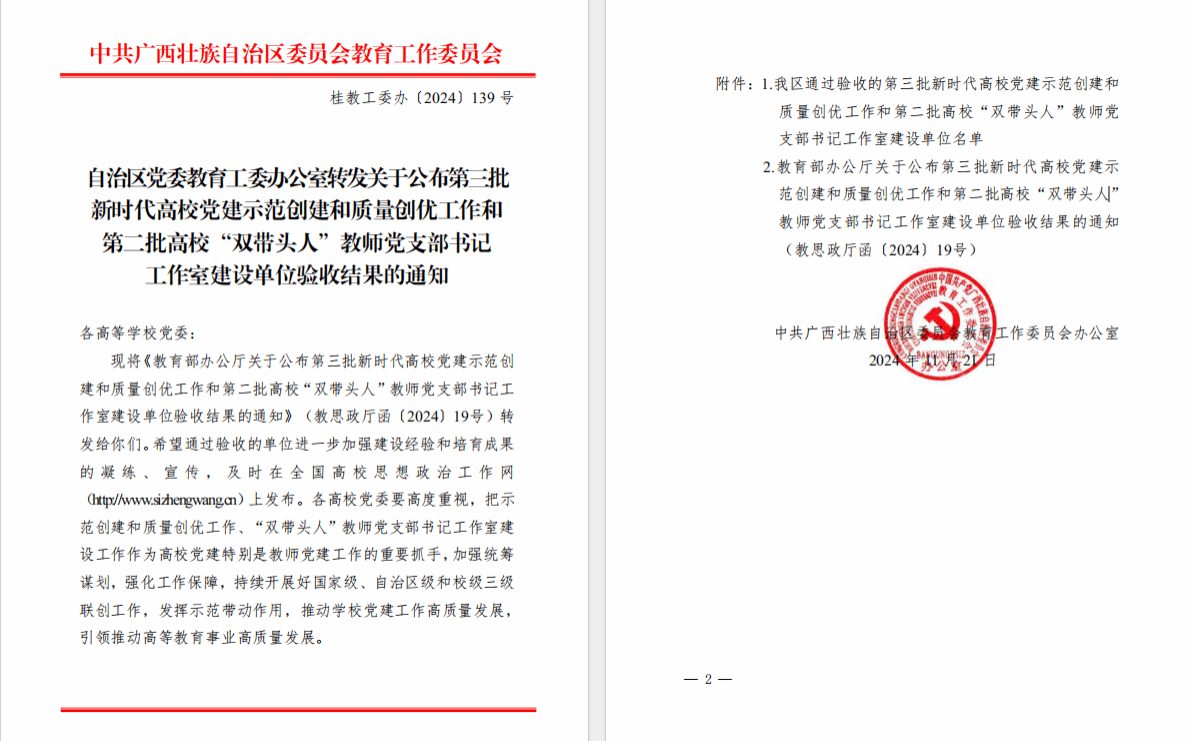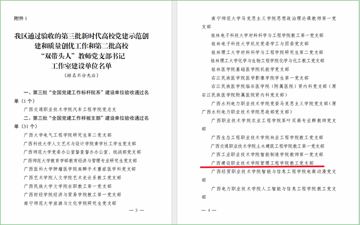 建设期内,教工党支部特色创建助推“党建+业务”双融双促。在党建引领下,学院教育教学工作硕果累累:入选广西新一轮高水平高职学校和专业群;通过首批新时代广西高校党建工作标杆院系、样板支部验收;通过广西职业教育工程造价专业教学资源库验收;获评2023年“自治区高校黄大年式教学团队”;获评2023年第二批全区高校“三全育人”综合改革示范院系(B类)。支部党员文桂萍老师获“全国三八红旗手”“国家教学名师”“全国模范教师”“全国教材建设先进个人”,周慧玲老师获自治区住建系统“2022年度五一巾帼标兵”,郭海棠老师获“全国辅导员年度人物”“自治区优秀教育工作者”、广西“最美高校辅导员”“2023年度广西三八红旗手”等称号。