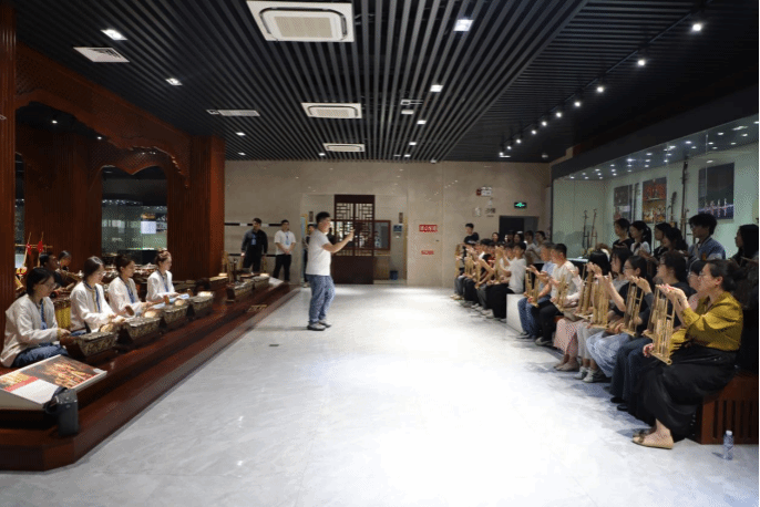 活动首站来到“古器之声”展厅,师生们近距离观摩了铜鼓、羊角纽钟、“烟墩大鼓乐”“马山大鼓乐”等。互动环节,师生们尝试敲击简单的大鼓音乐,路桥专业学生何建良感叹:“看似朴素的大鼓,却能发出跨越时空的和鸣,这就是中华文明生生不息的密码。”步入“八桂音韵”展厅,壮族的马骨胡、侗族的多耶芦笙、瑶族的长鼓等广西世居民族传统乐器尽收眼底。在“东南亚文化”主题展厅,越南独弦琴、泰国鳄鱼琴等跨国乐器,展现了广西与东盟国家“以乐为媒”的交流史。尤其是印度尼西亚的乐器“甘美兰”让人印象深刻,师生们还与馆内老师、演员互动,用安格隆乐器共同演奏出了具有浓郁印尼风格的动听乐曲。