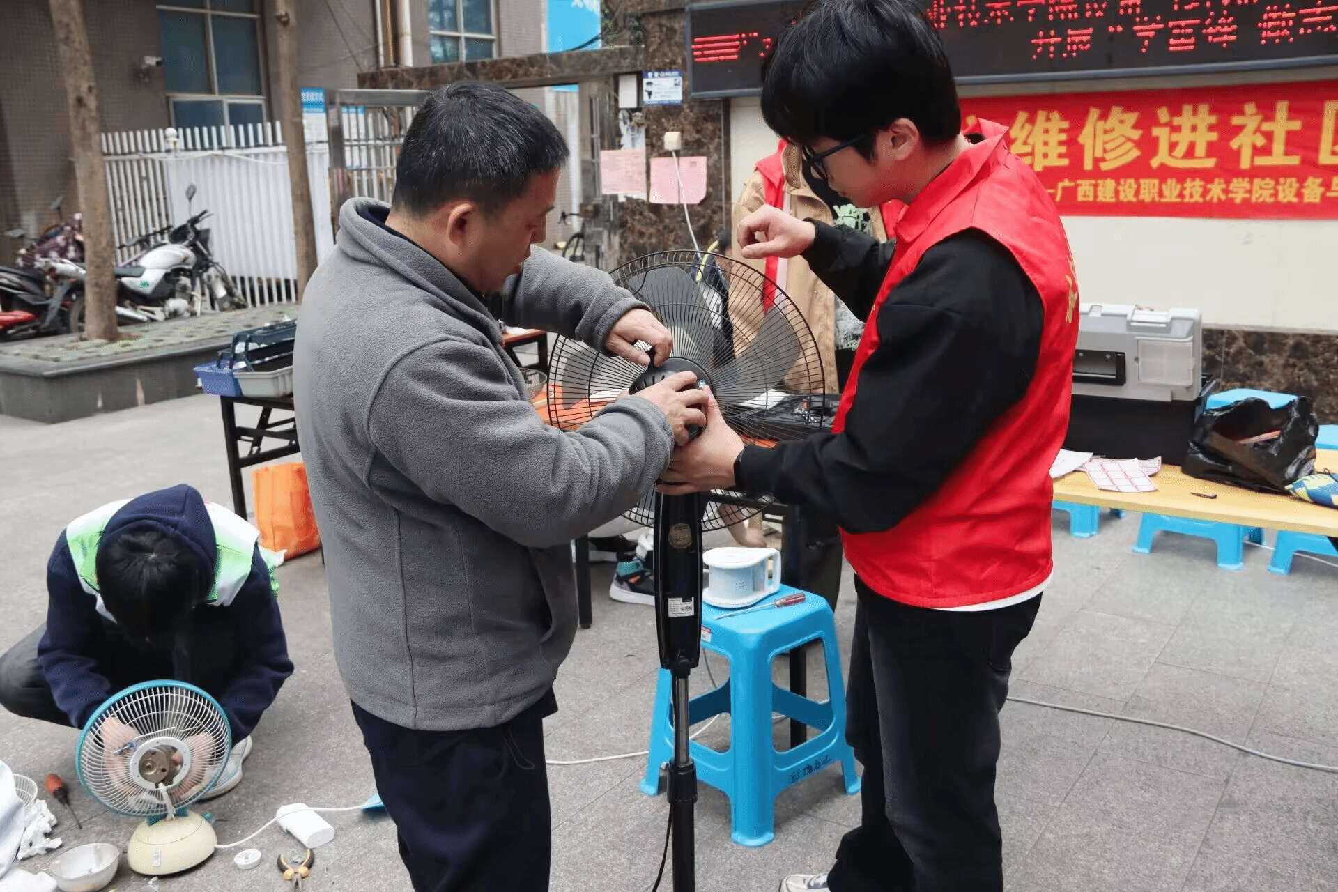 志愿者在维修故障电器