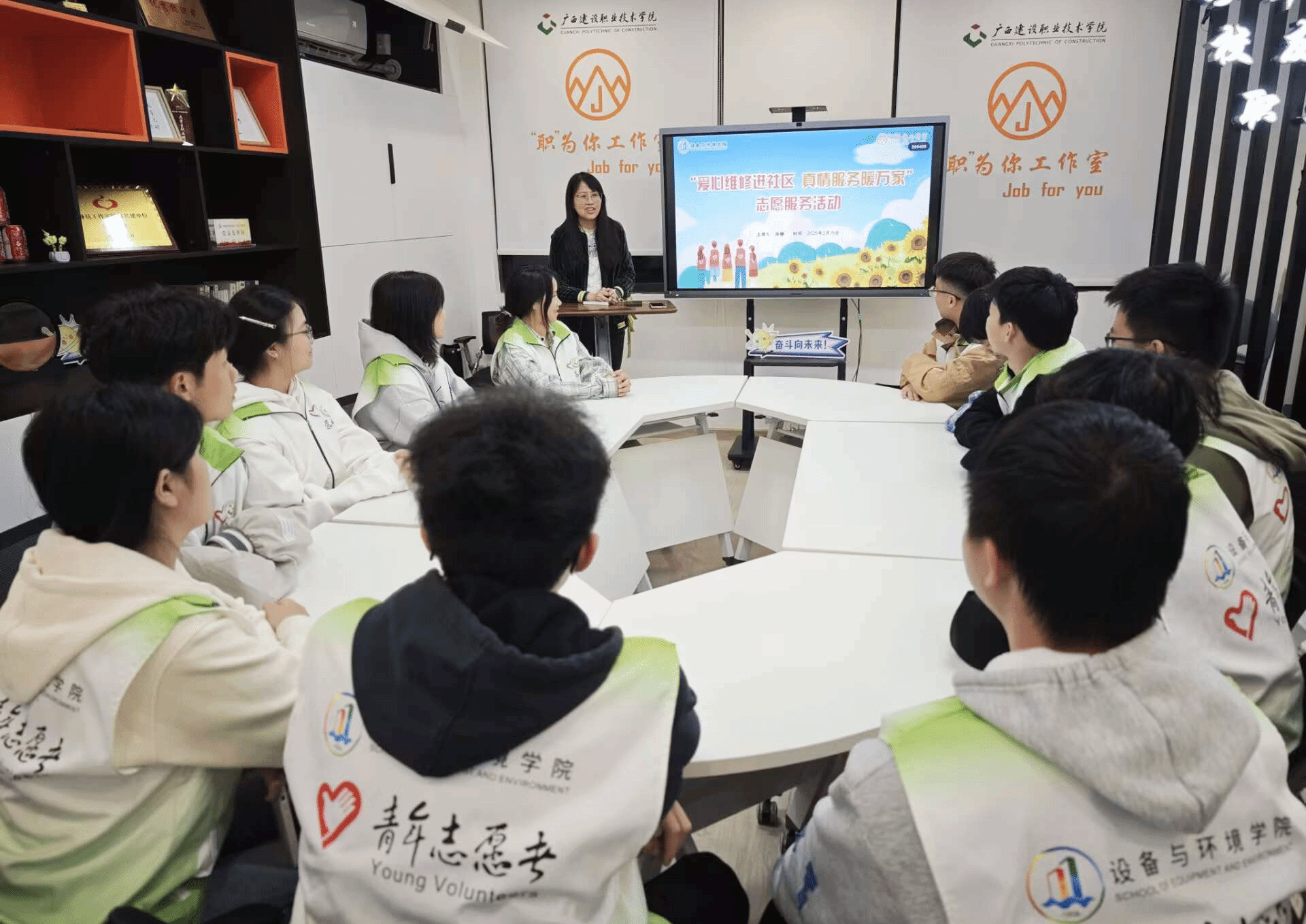 活动前夕,设备与环境学院团总支组织志愿服务队代表在“职”为你工作室开展安全培训会议,为志愿服务活动成功开展打下了基础。