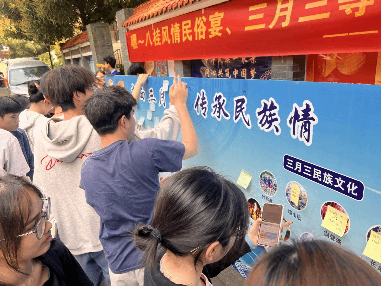 “我的家乡会举办千人长桌宴!”“我们村三月三要抢花炮、对山歌!”在学生社区,一幅由师生共同绘制的“壮乡民俗文化展板”格外醒目。活动面向全校师生征集家乡民俗故事,师生用文字和绘画记录下各地“三月三”的特色习俗与美食。来自多个民族的学子在展板前驻足交流,分享家乡故事,成了一堂生动的民族团结教育课。