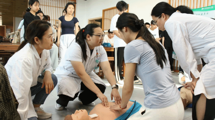活动中,医护人员通过理论讲解与实操演示,为学生普及了心肺复苏(CPR)和海姆立克急救法,强调“黄金救援时间”的重要性。
