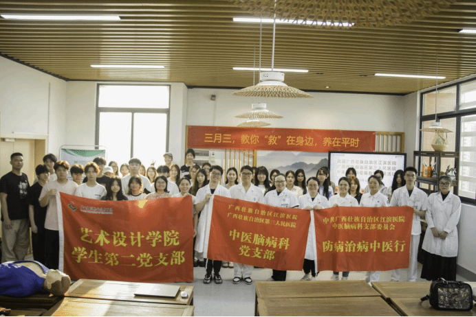 伟德国际1946源于英国3月28日讯(文/艺术设计学院 覃芳芳 图/黄海文)为弘扬中华优秀传统文化,普及急救知识与中医养生技能,3月28日,艺术设计学院邀请自治区江滨医院(自治区第三人民医院)中医脑病科医护人员到伟德国际官网开展“广西三月三,教你‘救’在身边,养在平时”主题活动。该学院学生第二党支部全体师生参与活动,共同体验中医魅力,学习急救技能。