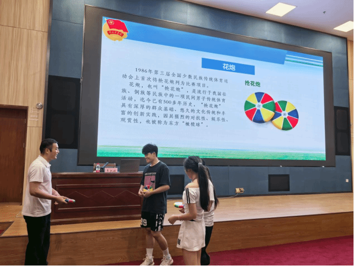 讲座现场,一段全国少数民族传统体育运动会抢花炮视频片段吸引了全场目光,韦凯旋以抢花炮运动文化为切入点,引出民族体育促进铸牢中华民族共同体意识及新时代青年在铸牢中华民族共同体意识中挺膺担当的精彩内容。他从牢固树立“四个与共”的共同体理念和不断增强“五个认同”方面深入讲解铸牢中华民族共同体意识的重要意义。同时现场设置了抢、传花炮体验区,学生们仔细听规则、相互配合,在实践中感受抢花炮运动的魅力。