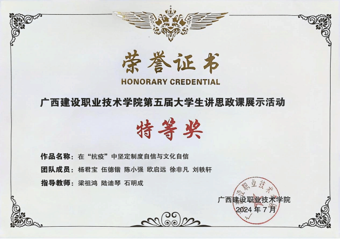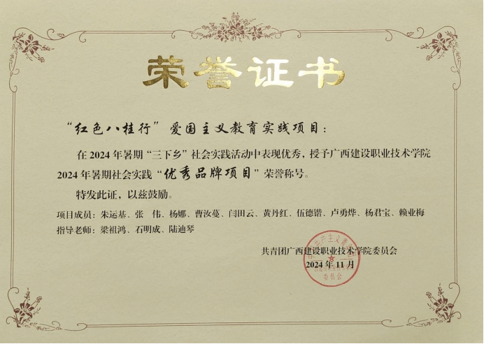 工作室组建的“红色八桂行”爱国主义教育实践团获评2024年全国暑期“三下乡”立项重点团队、校级“优秀品牌项目”等荣誉称号;工作室负责人主持的项目《“红色建筑情,青春八桂行”——红色建筑数智化微课堂》获评校级“第二课堂成绩单”精品课程;在学校第五届大学生讲思政课展示活动中获特等奖1项。