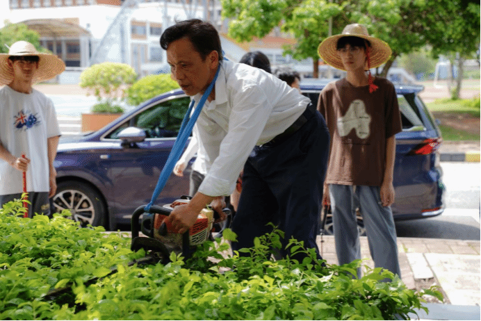 除了日常绿化养护等工作外,袁师傅还承担起劳动教育的重任,主要负责劳动周课程的实地教学,带领学生参与绿化劳动实践,手把手传授修剪、种植、除草等技巧,用生动的现场教学,激发同学们对劳动的热爱。学生们在翻土、播种、养护的过程中,练就吃苦耐劳的坚韧品格,同时也增强了同学们的责任感与团队协作能力。