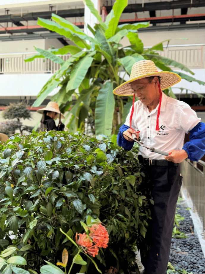 袁师傅手中的剪刀,早已超越了工具的范畴,它是画笔,是刻刀,是他雕琢美的“神器”。在他日复一日的精心呵护下,校园里的树木姿态优雅,宛如翩翩起舞的舞者;花卉应时而开,红的似火,粉的像霞,白的如雪,争奇斗艳;草坪平整如毯,绿意盎然。四季更迭,校园始终如画,每一处景致都凝聚着袁师傅的心血。