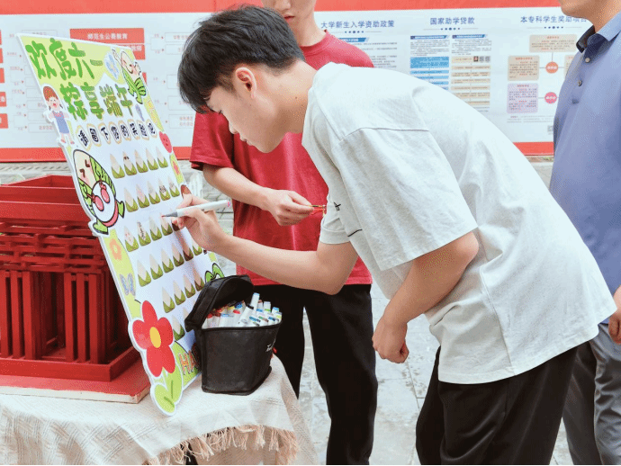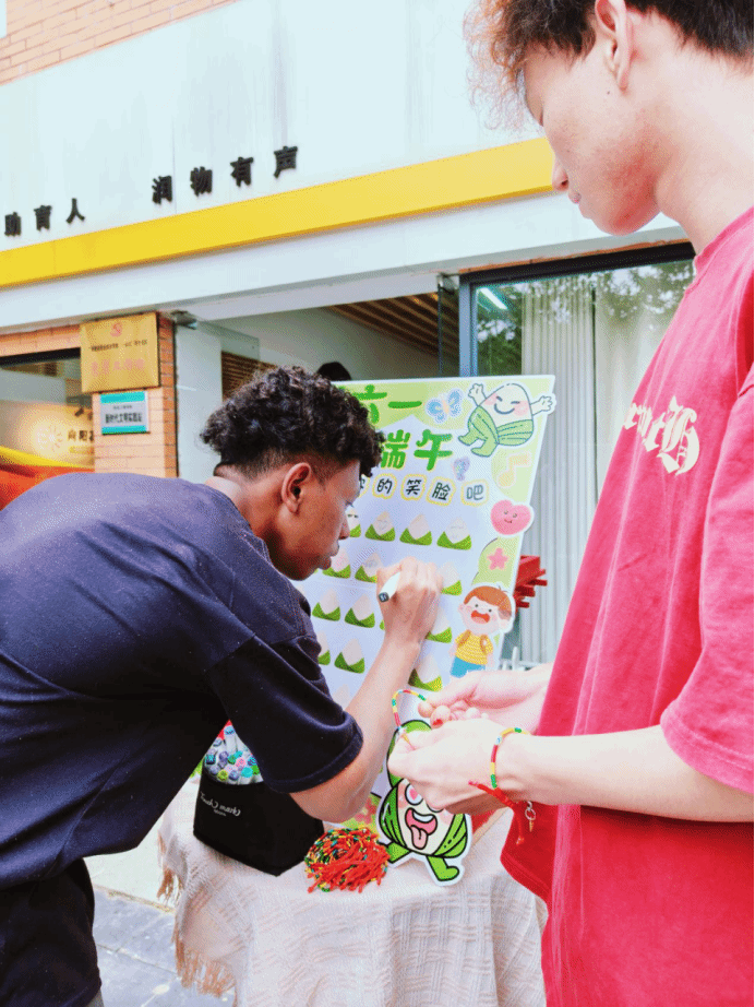 活动伊始,同学们用彩笔精心绘制出属于自己的笑脸,用明媚的笑容为端午节增添了温暖与活力。签到完成后,同学们领到一条彩绳,祈福在未来的日子里,都能拥有如彩绳般绚丽多彩的人生。