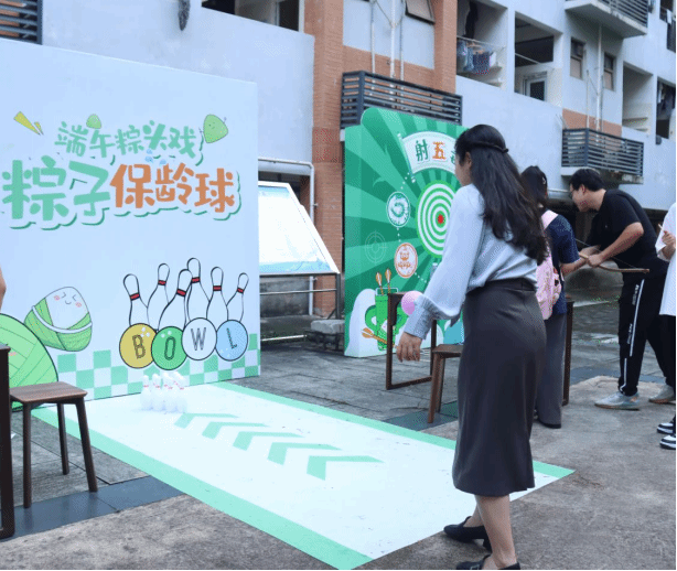游园会共设置四大主题体验区:在“射艺驱五毒”展位,参与者以传统弓箭射击象征瘟疫邪祟的靶标,在投壶竞技中感受古人“雅射”之礼;“粽趣保龄球”区域将端午元素与现代运动结合,特制造型瓶柱与端午主题彩球碰撞出阵阵欢笑;“古韵套圈”让参与者在投掷间体验传统游戏的雅致与欢愉;“巧手制香”工坊重现传统市集风情,师生们穿针引线,亲手缝制艾草香囊。活动全程采用“通关文牒”集章制,完成所有项目可兑换粽子奖品。