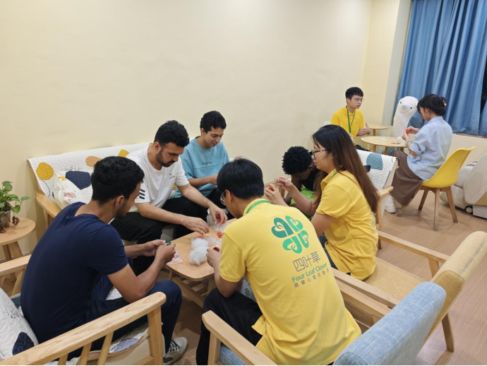 20余名留学生来到心灵驿站,和小草们一起在飞针走线间缝制可爱的皮革柿子钥匙扣。大家用指尖的创意链接彼此,建起中外学子友好交流的桥梁。