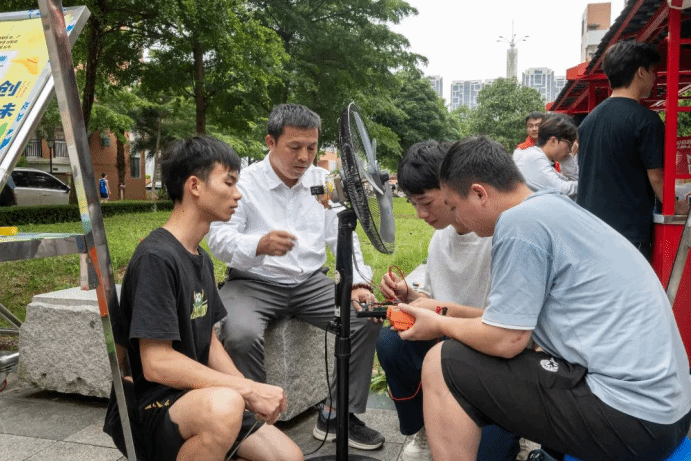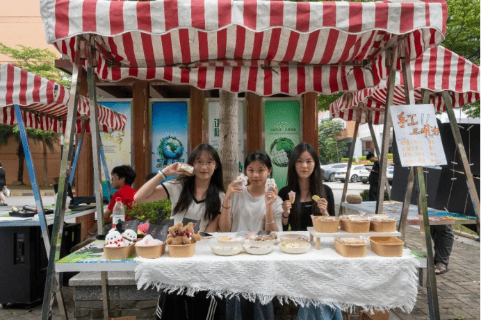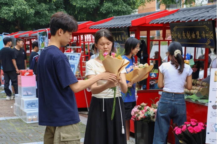 集市现场共有41个摊位进行产品销售与互动体验,吸引了千余名师生前来参与,现场气氛热烈。产品展销区摆满了学生们原创的手工饰品、科技小发明等物品,师生们纷纷驻足翻看,不时与“摊主”探讨设计细节,展现出对创意产品的浓厚兴趣;技能服务区内,摄影、维修、运营等服务有序推进,师生互动热络,同学们凭借自己的专业技能为大家提供便利,彰显了实践能力;而创意体验区则最为热闹,茶艺、花艺等体验台前围满了参与者,指导老师穿梭其间示范技巧,大家积极参与体验,现场充满了欢快的氛围。
