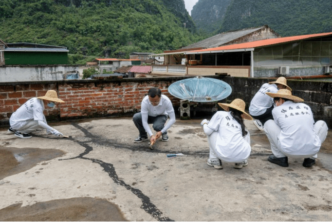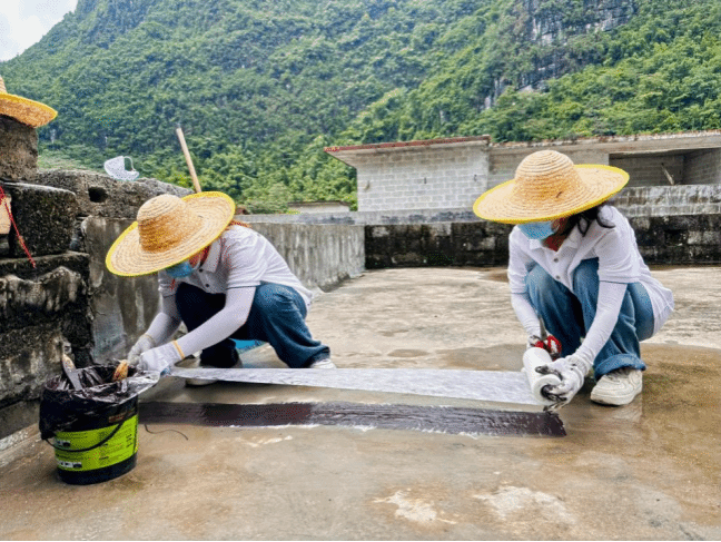 面对村民反映强烈的屋顶漏水问题,实践团充分发挥建筑专业优势,精准施策。队员们顶着烈日,在深入勘查每户房屋的渗漏点位和严重程度后,一丝不苟地“清”理裂缝灰尘与松动基面、“贴”覆高强度抗撕裂布、“涂”抹优质防水涂料。实践团成员们不惧酷暑,凭借过硬的专业技能和高效的团队协作,成功为69户村民解除了长期受房屋漏水的困扰的难题。