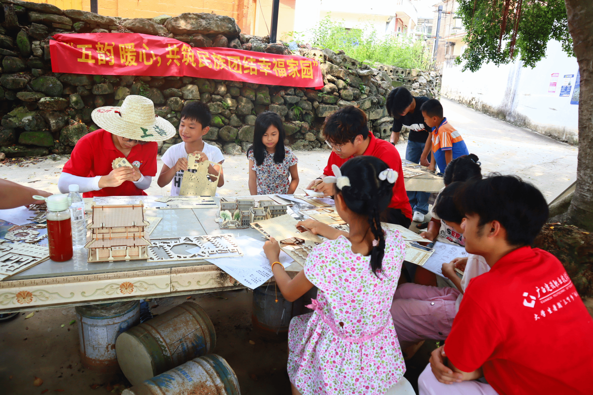 实践团以“非遗+趣味”为特色,为当地儿童开设系列文化体验课程。在榫卯建筑手工搭建活动中,孩子们通过组装构件感受传统建筑的精妙;非遗扎染课堂上,蓝白相间的图案展现了传统工艺的魅力;铜鼓模型制作环节,孩子们精心绘制壮锦纹理,体验民族文化精髓;“我心中的三江坡”主题绘画课则让孩子们用画笔表达对家乡的热爱。