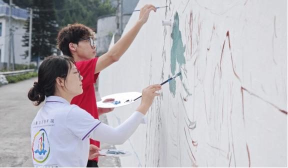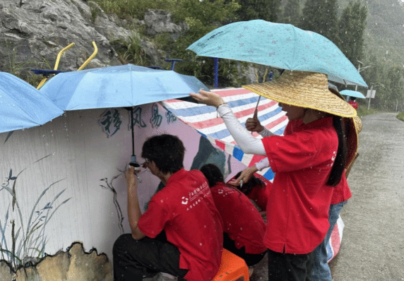 实践团成员冒雨绘墙(图/李兆健)