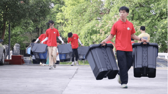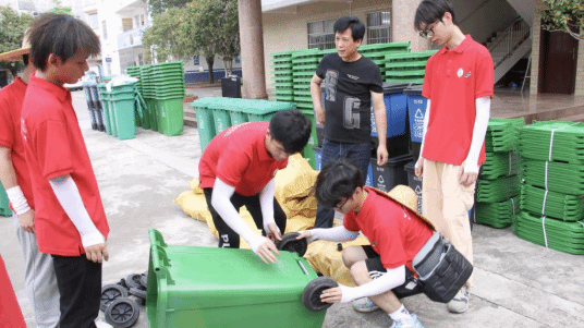 实践团成员搬运分类垃圾桶