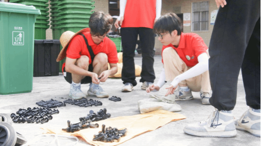 实践团成员清点垃圾桶组装配件