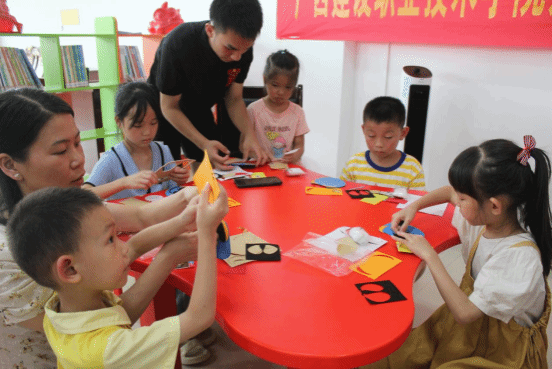 服务团成员与家长、小朋友共同粘贴醒狮头