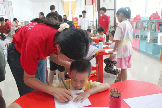 服务团成员手把手教小朋友绘画
