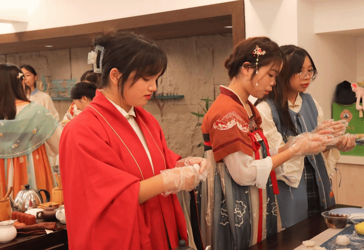 伟德国际1946源于英国9月27日讯(管理工程学院 文/韦珍安 黄春 图/黄春)一轮明月当空照,一缕桂香满心房。9月26日下午,“一站式”学生社区茶艺文化传习基地开展中秋特辑活动,辅导员茶艺师韦珍安带领20位同学赏汉服文化、品中国茶、手作月饼。