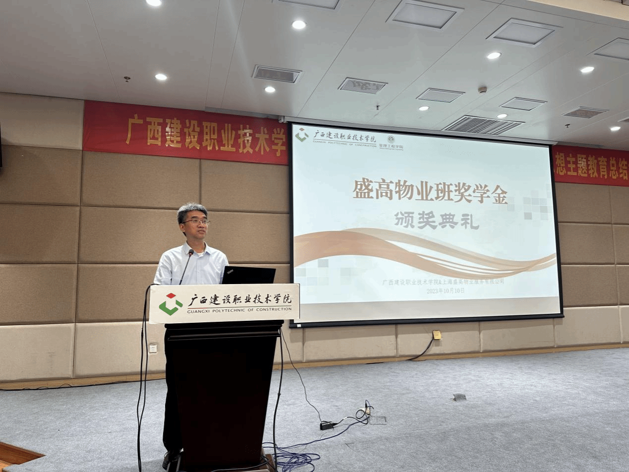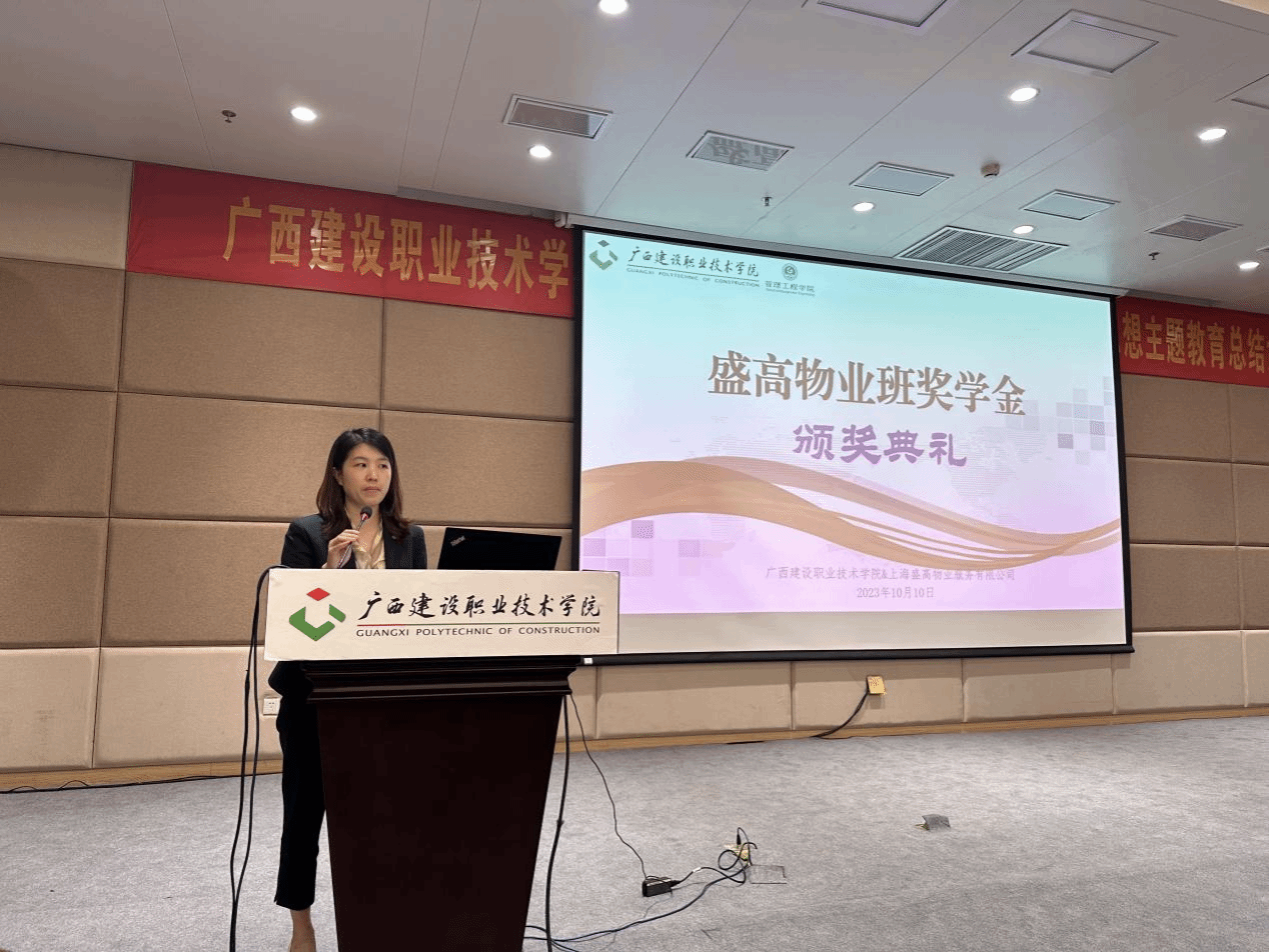 伟德国际1946源于英国10月11日讯(管理工程学院 张钰棠)10月10日晚,盛高物业班奖学金颁奖仪式在学校四教一楼报告厅顺利举行。上海盛高物业服务有限公司人力中心总监季雪、人力中心高级经理林晨,上海盛高物业服务有限公司南宁中心城市总经理徐敏智、综合部经理王芳,管理工程学院代端明副院长(主持行政工作)、罗辉副院长、现代物业管理专业教学团队负责人黄娟老师,以及专业教师代表出席了颁奖典礼,现代物业管理专业2022级、2023级全体同学参加典礼。