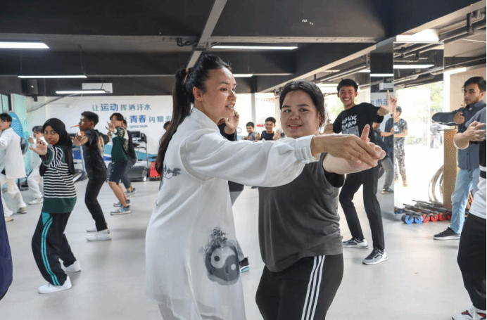 陈红秀老师带领太极拳校队同学给参加活动的留学生们进行八段锦授课,展示了八段锦的优美动作,并进行分解练习和逐个指导,让大家进一步感受到了中国传统体育健身项目的魅力。
