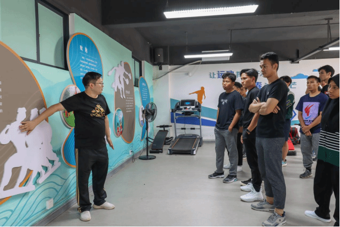 此外,知行工作室黄华老师结合健身吧文化墙向留学生们介绍了健身吧目前开展的相关活动,以及芦笙舞、绣球、毽球、板鞋竞速等传统体育健身项目,表示欢迎大家利用课余时间到健身吧参加每日健身打卡、每周健身挑战以及传统民族体育活动,在充实校园生活的同时强身健体。
