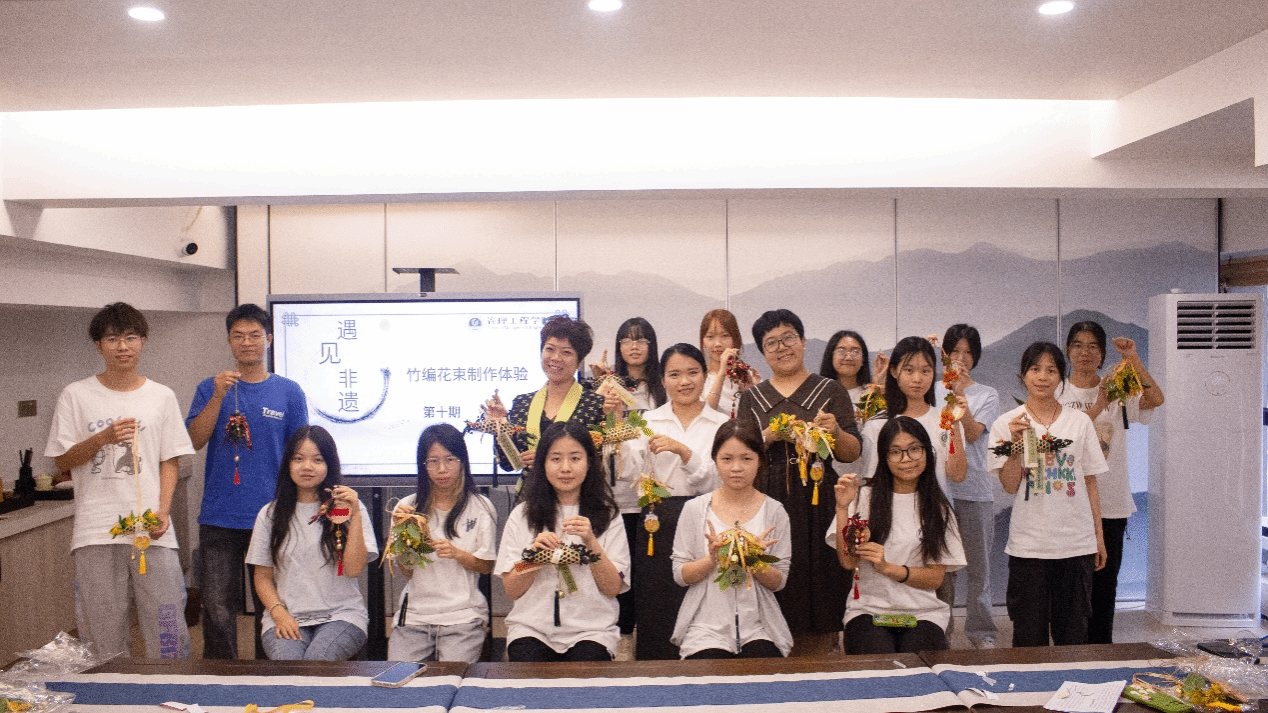 马克思主义学院教师毕莉、郜云、谢雪瑜三位老师分别向同学们介绍了竹编的创建发展史,带领同学们亲手编制竹编花束挂饰,沉浸式体验竹编文化。通过现场教学与实操互动,推动非遗项目与学校教育有机结合,引导同学们领略非遗文化的魅力,进一步铸牢中华民族共同体意识。