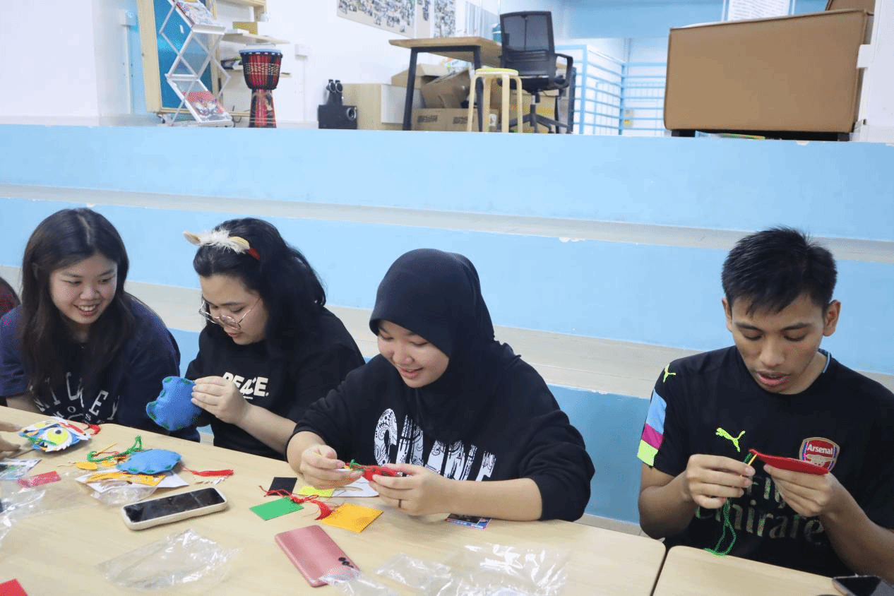 留学生们在制作醒狮香包