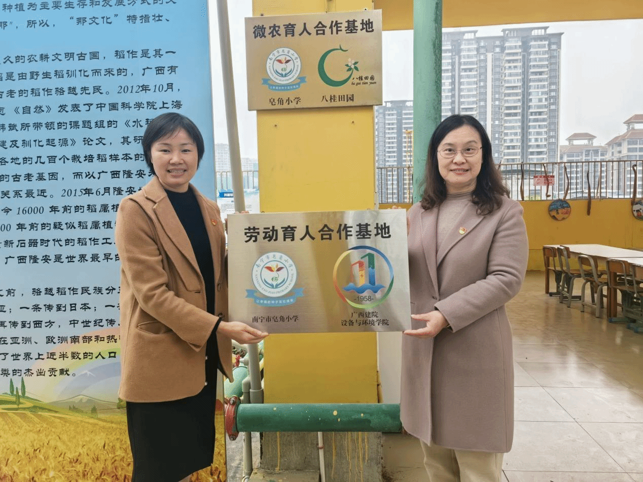 随后,双方开展调研交流。座谈会上,双方就党建联建、合力育人、劳动教育的内容、形式、实践经验等方面进行了深入交流,达成了合作共识,初步探讨了未来的共建方向,并举行了“劳动育人合作基地”挂牌仪式。在热烈的掌声中,设备与环境学院党总支书记侯文淑与南宁市皂角小学校长陈华静在小学“幸福农场”共同对“劳动育人合作基地”进行挂牌。这也标志着双方在劳动教育领域的深度合作正式启航。双方表示,将共同努力推动劳动教育事业的发展,培养更多有担当、有创造力的优秀青少年。
