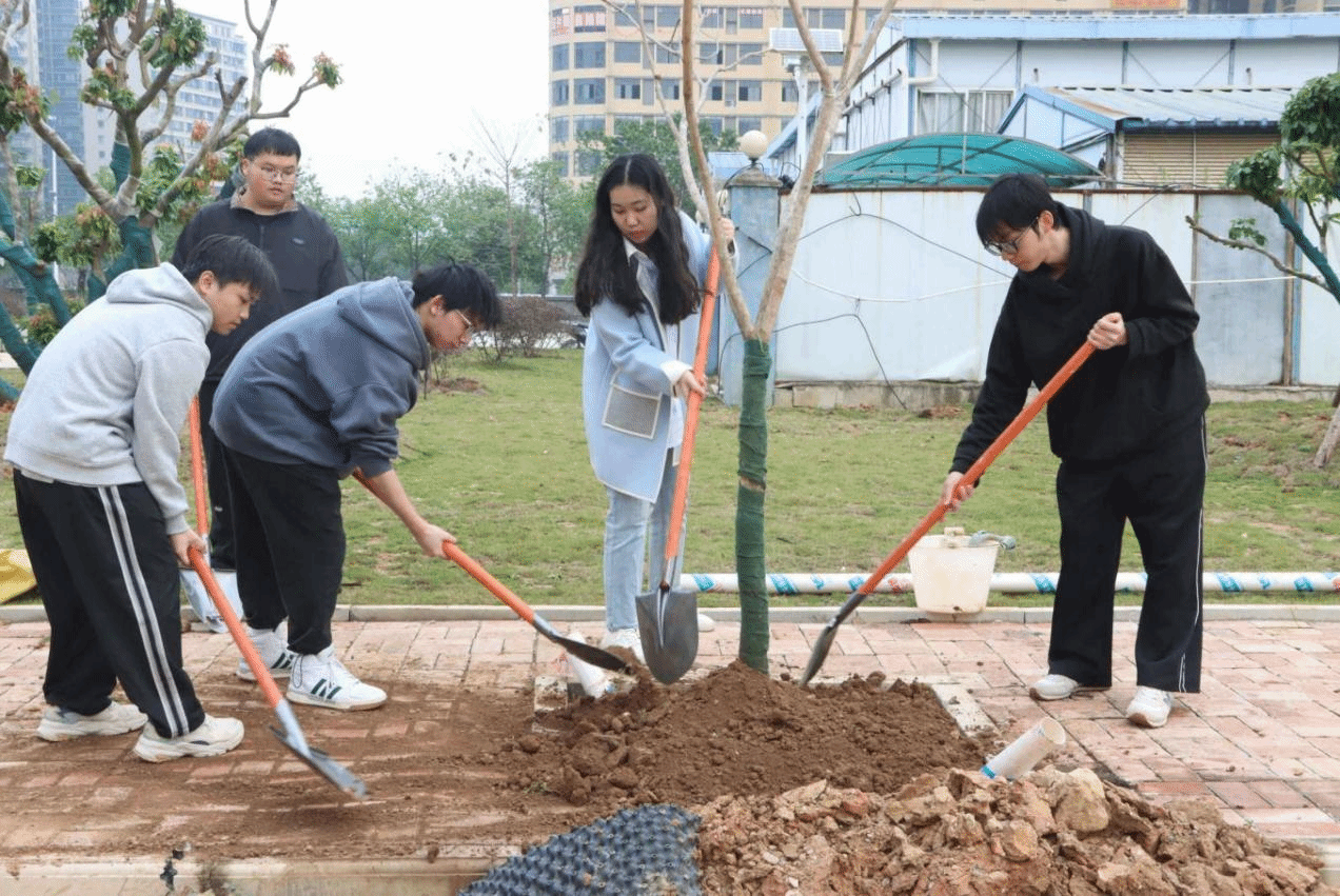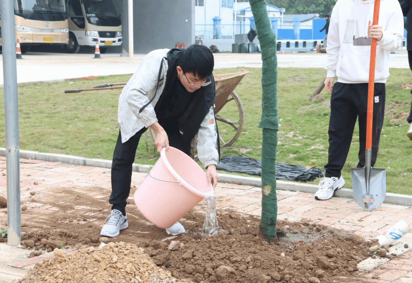 活动现场,老师和同学们在园艺师傅的专业指导下,分工明确,井然有序。挥锹铲土、扶苗培土、踩实浇水,在大家的欢声笑语中,共同种下象征生机与活力的风铃树苗。经过一上午的辛勤劳动,只见一株株小树苗迎风挺立,在和煦的春风中呈现着勃勃生机。