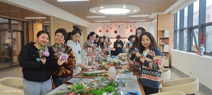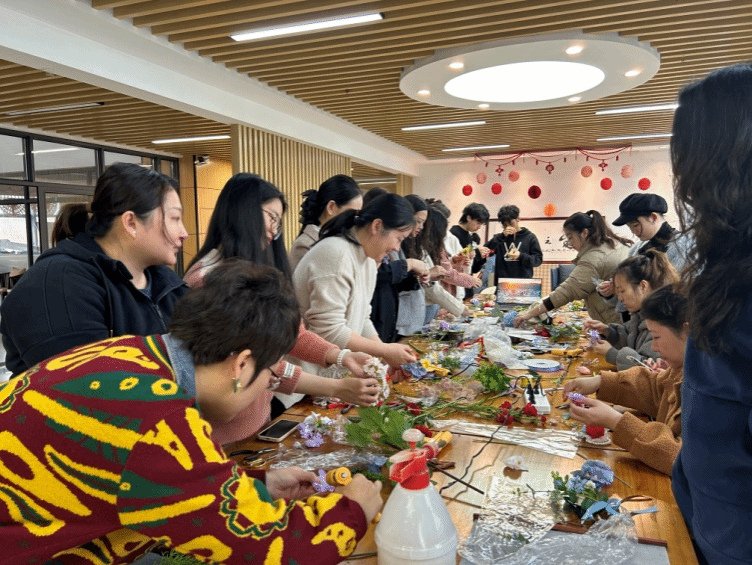 在建筑与规划学院花艺专业志愿者的指导下,女职工们学习了花饰的制作技巧,包括花材的选择、搭配、修剪和固定等。大家充分发挥自己的想象力和创造力,制作出一个个独具特色的胸花、腕花和头花。有的女职工选择鲜艳的花朵,展现自己的活力和热情;有的选择清新的花朵,表达自己的温柔和优雅。每一朵花饰都代表着女职工的个性和风采。