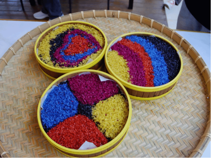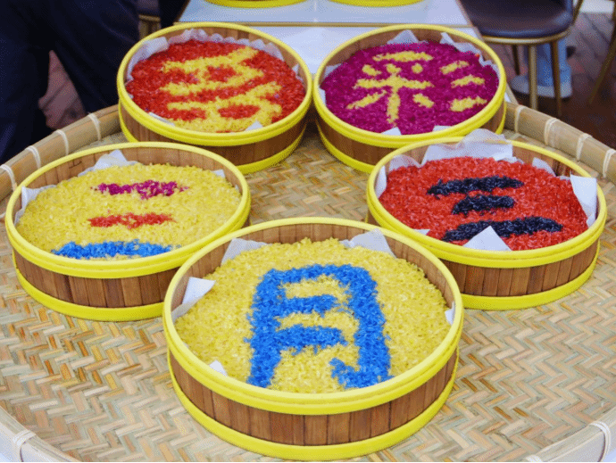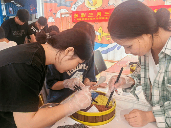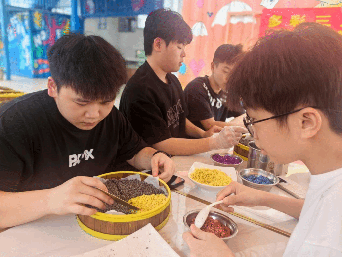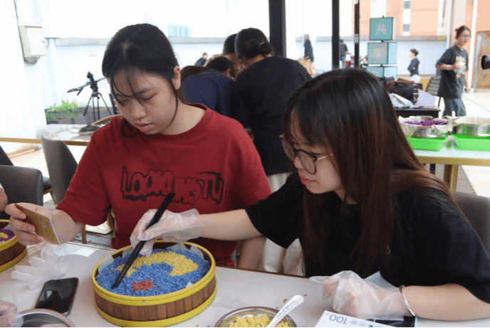 活动中,徐晓雪老师带领同学们重温了“广西三月三”传统节日的由来。在徐晓雪、李悉娴两位老师的指导下,同学们开始忙碌起来,完成剁原料、熬煮植物染料、泡制糯米等一道道工序,为次日糯米饭蒸制做好了准备。经历了10小时浸泡,糯米色泽鲜艳,晶莹透亮。同学们摩拳擦掌,跃跃欲试,随即开始了五色糯米饭拼盘创作活动。同学们用灵巧的双手和五彩斑斓的糯米饭呈现了不同的节日创意。大家纷纷展示自己的作品,现场欢笑声不绝于耳,节日氛围浓厚。