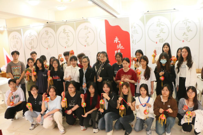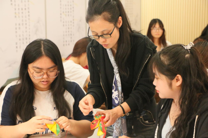 活动的最后,王秀芬老师还来到了知行工作室的活动场地之一——非遗工作坊,与同学们一起进行绣球制作的互动教学。在王老师的鼓励和手把手的教学下,一颗颗手工绣球从同学们的手中制作了出来。这种亲身体验让同学们对绣球有了更加深刻的理解,激发了学生对于非遗传承的积极性和自信心。