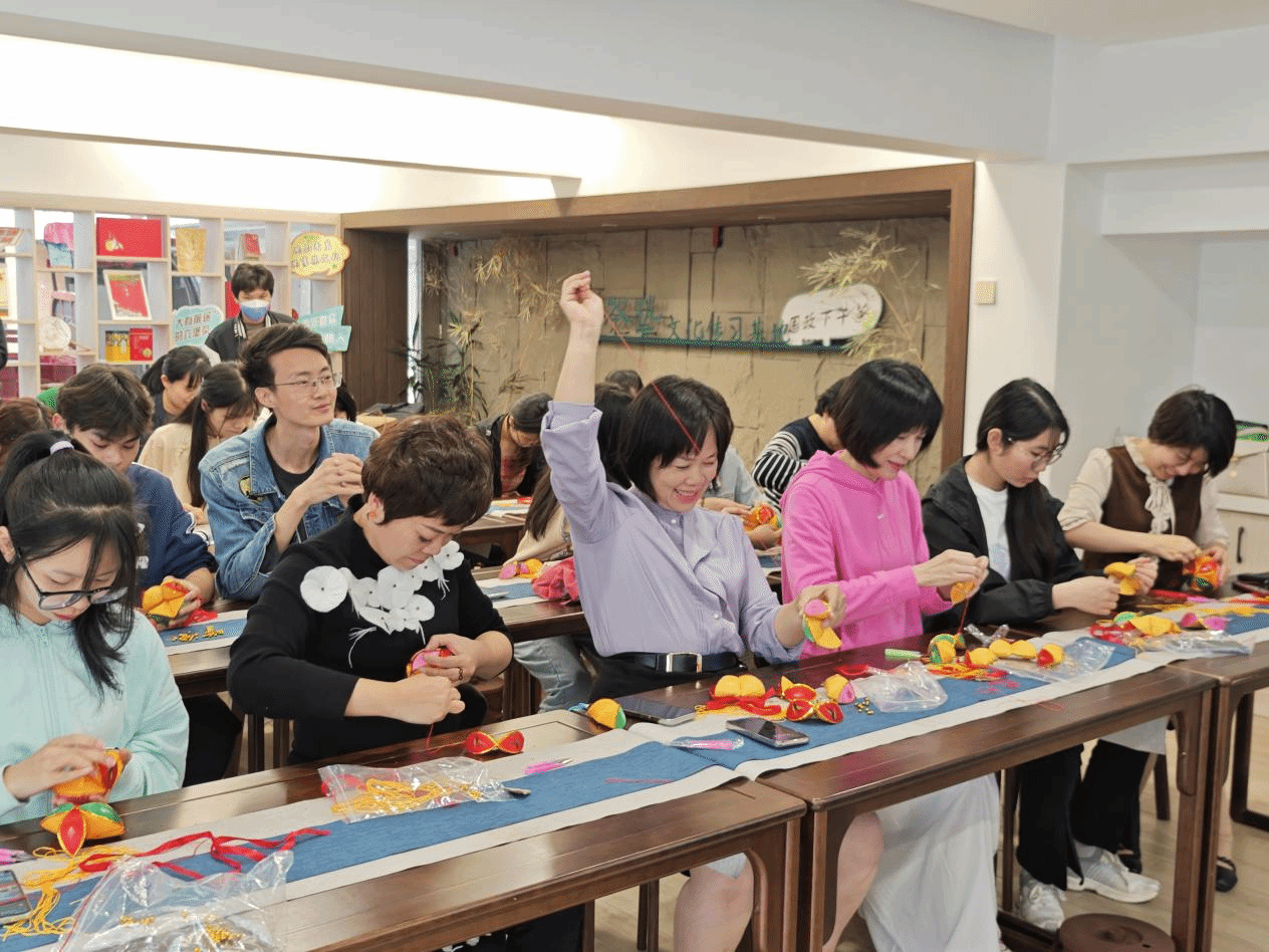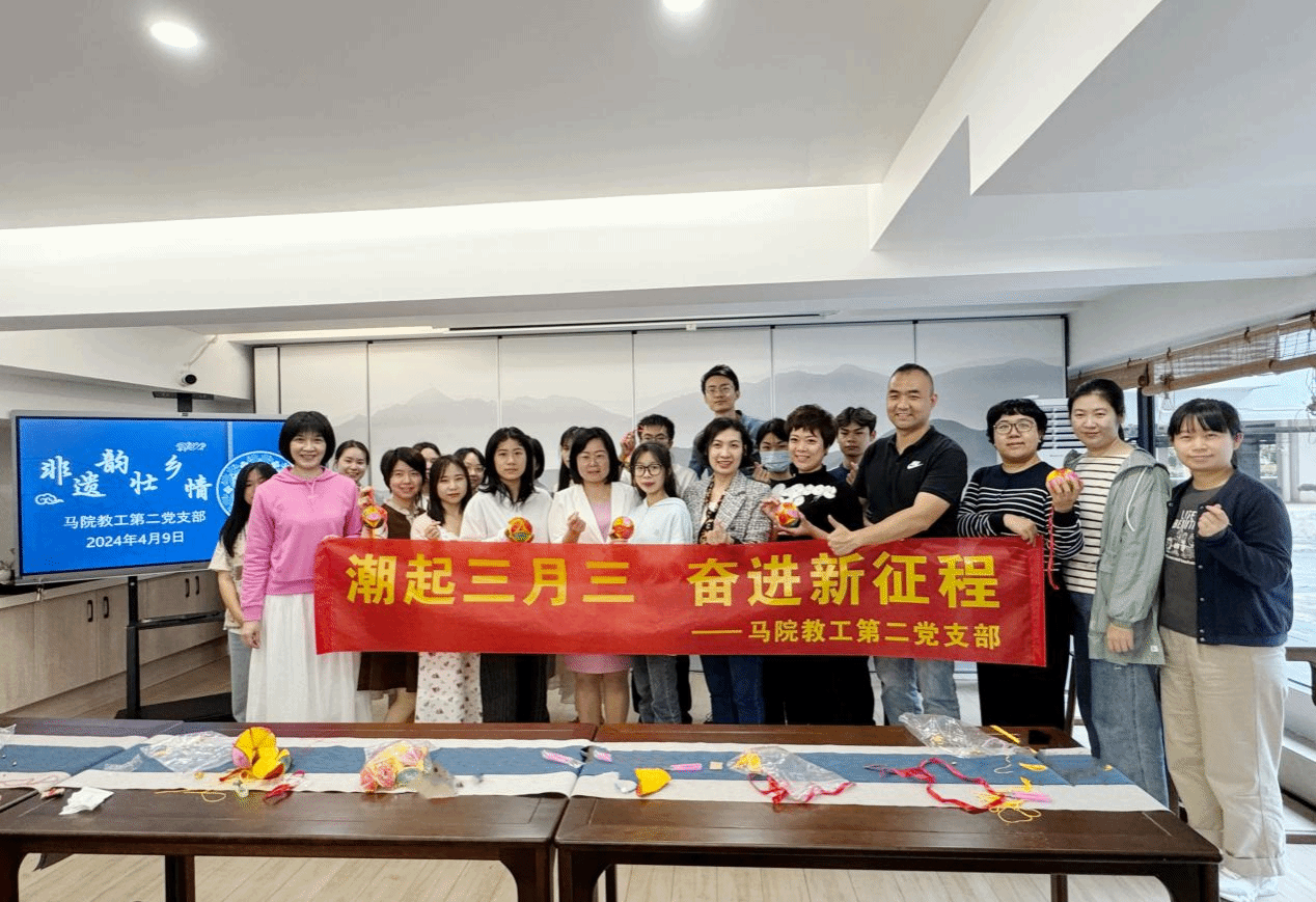 民族文化体验活动在跳竹竿舞中拉开了帷幕。随后,马院教工第二党支部副书记莫玉婵向师生们详细介绍了“广西三月三”的文化内涵,以及绣球的历史渊源与制作工艺,让师生们了解到绣球有团结、美满、希望、健康等美好的寓意。师生们通过亲手制作手工绣球,感受壮族人民独特的民族文化和手工艺魅力。在制作绣球的过程中,现场气氛热烈而温馨,师生们互相交流制作心得,在一针一线中感悟“非遗文化”的内涵和魅力,提升民族自豪感。