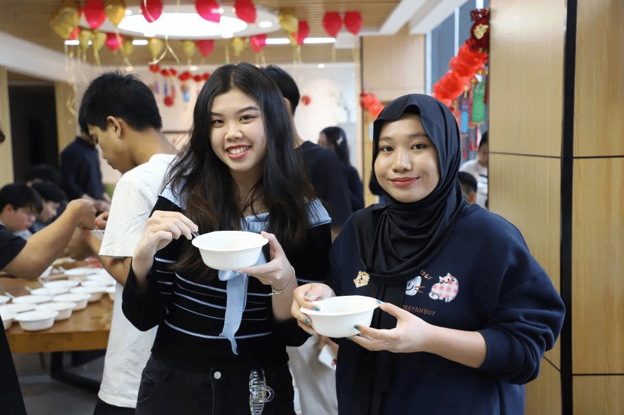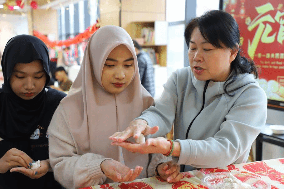 最受欢迎的环节莫过于“包汤圆、品汤圆”。在老师们的悉心指导下,留学生们亲手揉面团、包馅料,沉浸于传统汤圆的制作乐趣中。学校食堂特别准备了黑芝麻、花生以及无馅的多彩小汤圆,搭配上红糖姜水和醪糟甜酒,为整个活动增添了一抹温馨的暖意。来自印度尼西亚的学生徐胜佳一边品尝汤圆,一边感慨道:“汤圆的甜味,就像今天的氛围一样温暖人心。”