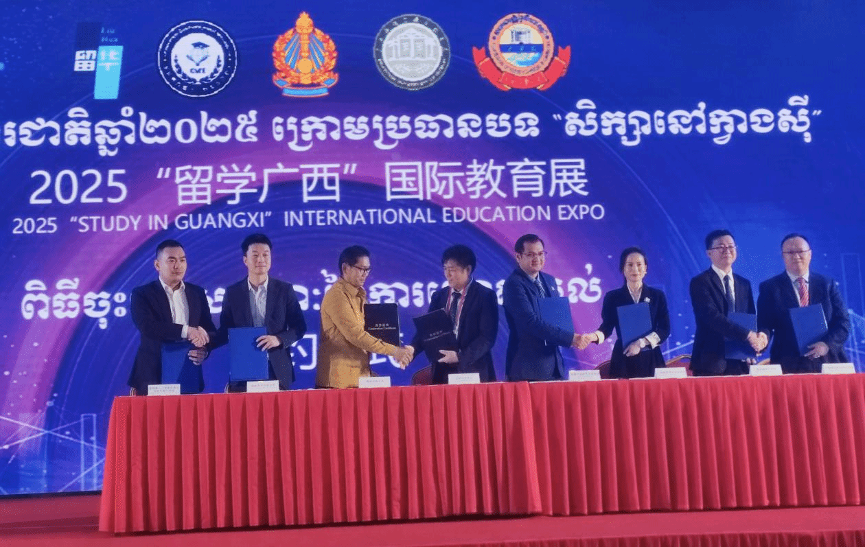 访问团先后拜访了广西华蓝集团柬埔寨办事处(以下简称“华蓝柬埔寨办事处”)、柬埔寨劳动与职业培训部(以下简称“柬埔寨劳工部”)、中国建筑第四工程局(柬埔寨)有限公司(以下简称“中建四局柬埔寨公司”)、柬埔寨国家技术培训学院、柬埔寨中国学校;受邀参加了第二届中国—东南亚国际技术教育合作峰会、2025年“留学广西”国际教育展,并在由自治区教育厅和柬华理事总会共同主办的“产业•专业•职业”融合人工智能人才培养论坛(柬埔寨站)上作主旨发言。