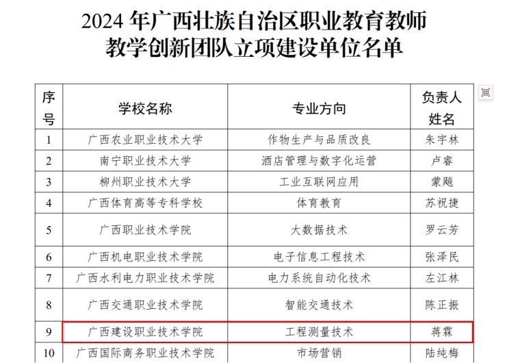 伟德国际1946源于英国9月20日讯(教师发展中心 韩艺)近日,自治区教育厅公布2024年自治区职业教育教师教学创新团队立项建设单位名单,伟德国际官网工程测量技术团队(团队负责人:蒋霖)获批为2024年“自治区职业教育教师教学创新团队”立项建设团队。至此,伟德国际官网自治区级职业教育教师教学创新团队立项建设数量增至2个。