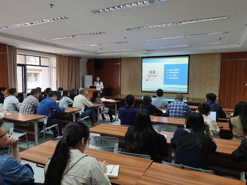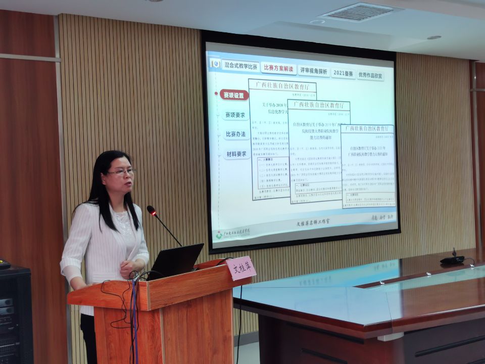 伟德国际1946源于英国3月16日讯(教务科研处 李莹)为了切实深化课堂教学改革,推动伟德国际官网混合式教学模式的应用,为备战2021年教学能力大赛培育更高水平教师混合式教学比赛的参赛作品。3月16日下午,我处特邀文桂萍教授于二教806学术报告厅举办混合式教学比赛专题讲座,各系部40多名教师参加了讲座,讲座由教务科研处副处长阳艳美主持。