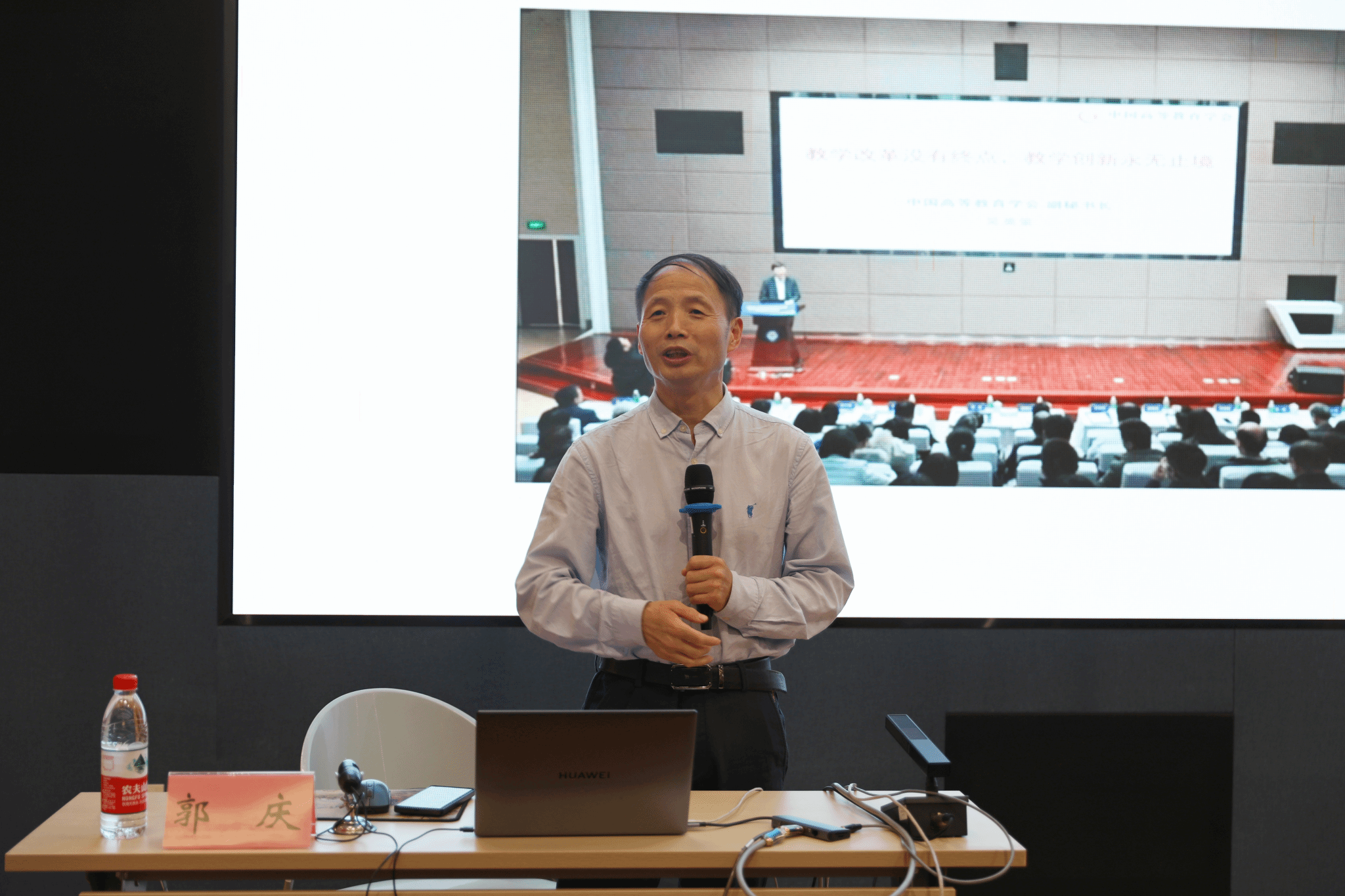讲座中,郭庆教授以其深厚的学术底蕴和丰富的实践经验,对人工智能背景下的高校教师数字素养提升进行了深入剖析与前瞻探讨。郭教授介绍了人工智能发展现状,详细展示了教学设计与课件创设过程和教师数字素养提升路径,并用生动语言阐述了理性冷静实用的行为导向、“应用为王”的全新思维和教学模式的应用。他指出,高校教师应积极运用人工智能、大数据、云计算等前沿技术,充分应用数字化手段,实现个性化教学、精准教学,提升教学效果。