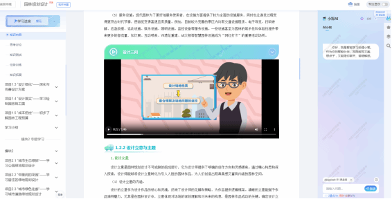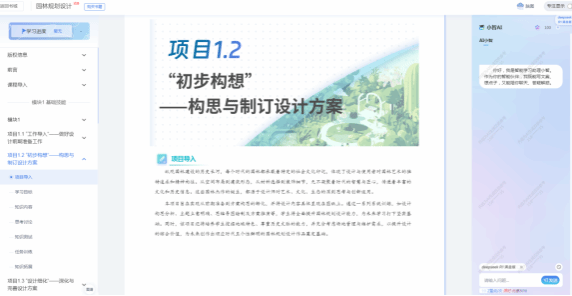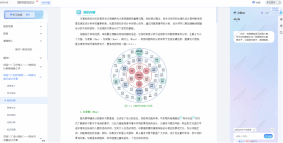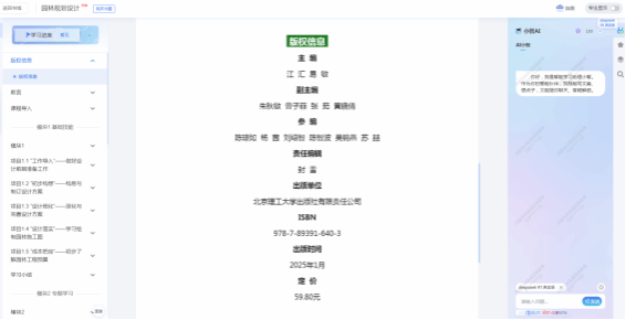 《园林规划设计》教材以培养高素质技能型人才为目标,紧密对接行业岗位需求,构建“职业能力提升、技术迭代创新、思政价值塑造”三位一体的教学体系。通过“基础认知层→专项能力层→综合创新层”三阶递进架构,将5个专题项目与6个探索提升项目有机串联,形成理论与实践深度融合的课程体系。教材创新采用“案例贯穿式+技术沉浸式+思政浸润式”三维教学模式,融入智慧园林、生态修复、数字景观等前沿技术,打造“理实一体、德技并修”的教学新范式。