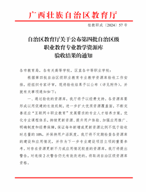 教材配套课程所在的自治区级职业教育专业教学资源库验收通过证明材料。