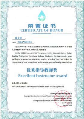 4.7教材主编杨文婷老师指导学生应用教材情境一水质评价技能内容,荣获2024年中国-东盟职业水质检测职业技能邀请赛一等奖