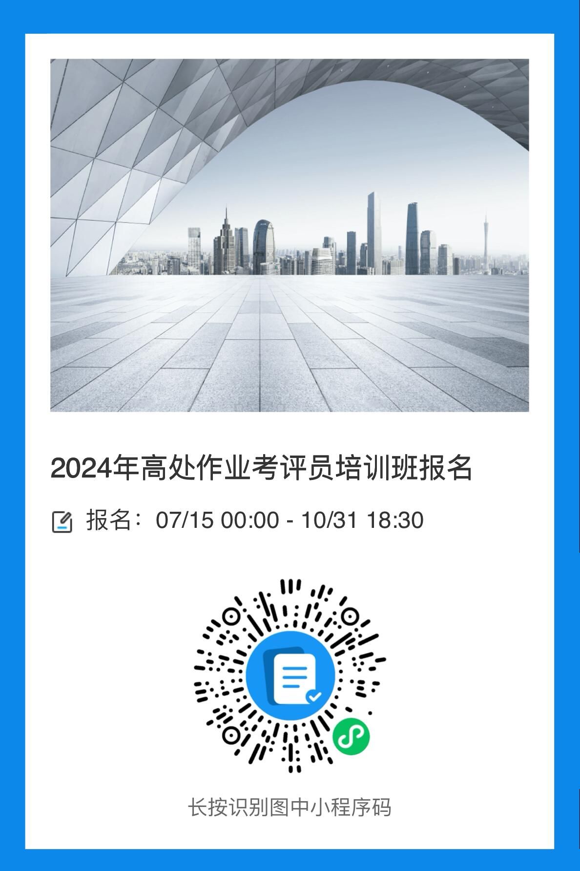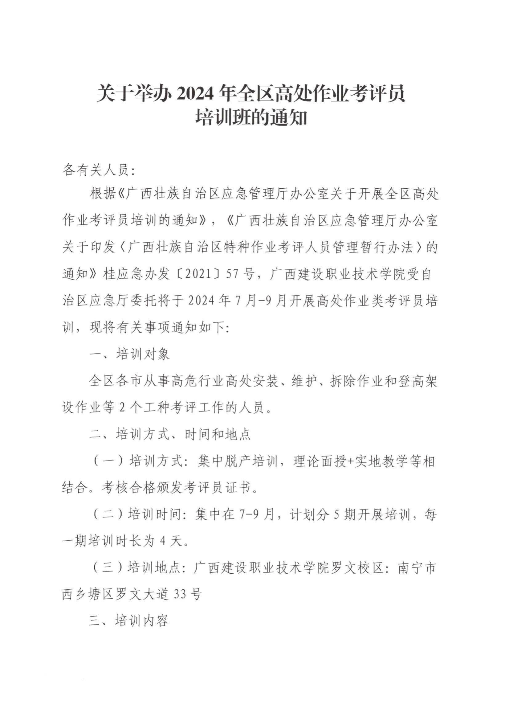 培训通知 当前位置: 首页 >> 培训通知 >> 正文 关于举办2024年全区高处作业考评员培训的通知 发布日期:2024-07-24 点击: 附件【2024年全区高处作业考评员培训报名二维码.jpg】已下载次 附件【关于举办2024年全区高处作业考评员培训的通知.pdf】已下载次