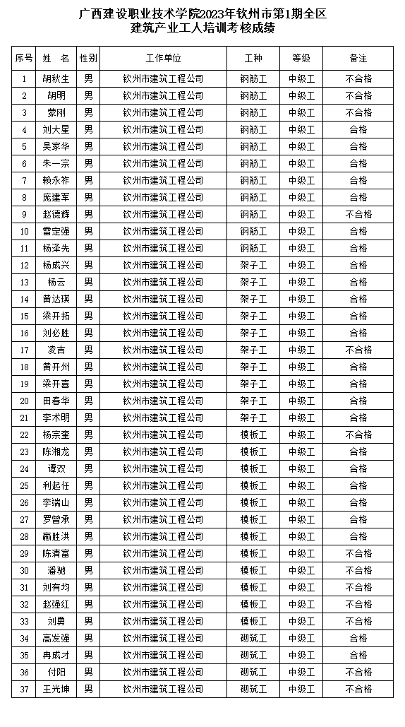 伟德国际1946源于英国2023年钦州市第1期全区建筑产业工人培训考核工作已经结束,根据《广西壮族自治区建筑工人职业培训考核实施办法(试行)的通知》(桂建人〔2015〕66号)等有关文件规定,现对参训人员培训考核成绩进行公示,公示期为本公示发布之日起5个工作日。