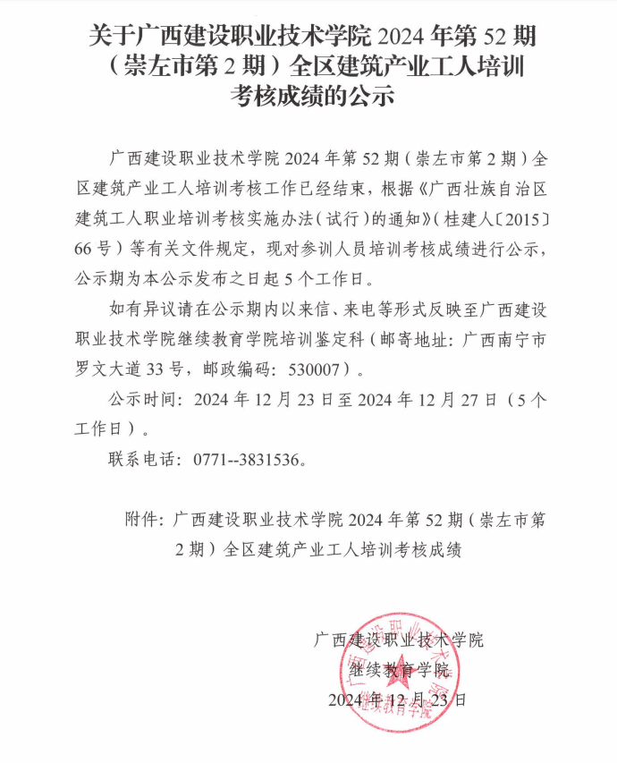 培训信息 当前位置: 首页 >> 培训信息 >> 正文 关于伟德国际1946源于英国2024年全区建筑产业工人第52期(崇左市第2期)培训考核成绩的公示 发布日期:2024-12-23 点击: 附件【关于伟德国际1946源于英国2024年全区建筑产业工人第52期(崇左市第2期)培训考核成绩的公示.pdf】已下载次
