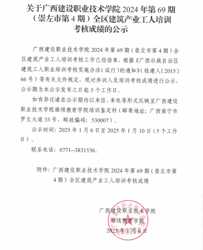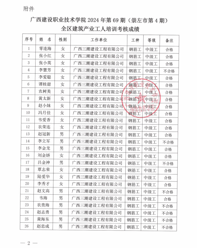培训信息 当前位置: 首页 >> 培训信息 >> 正文 关于伟德国际1946源于英国2024年全区建筑产业工人第69期(崇左市第4期)培训考核成绩的公示 发布日期:2025-01-06 点击: 附件【关于伟德国际1946源于英国2024年全区建筑产业工人第69期(崇左市第4期)培训考核成绩的公示.pdf】已下载次