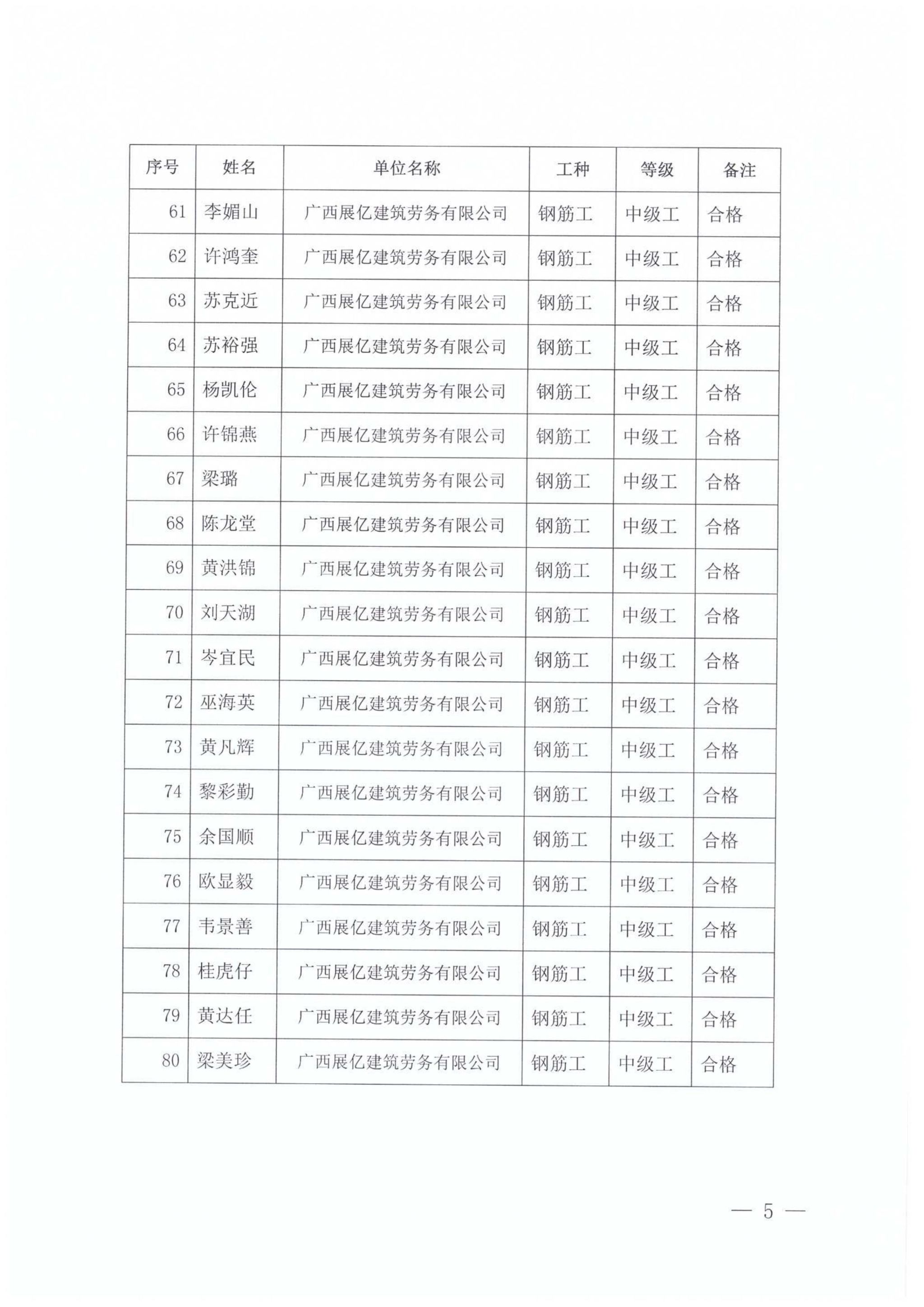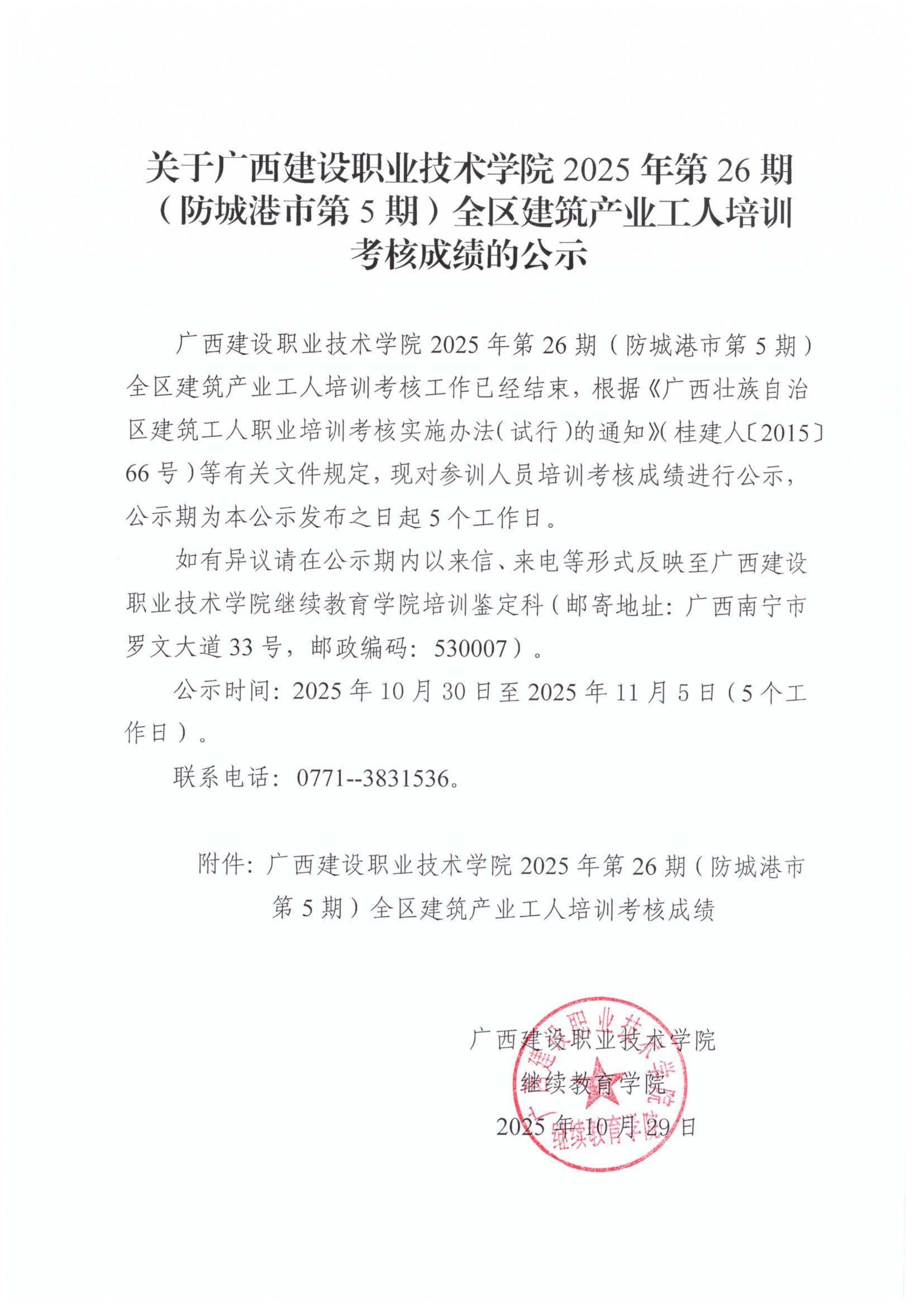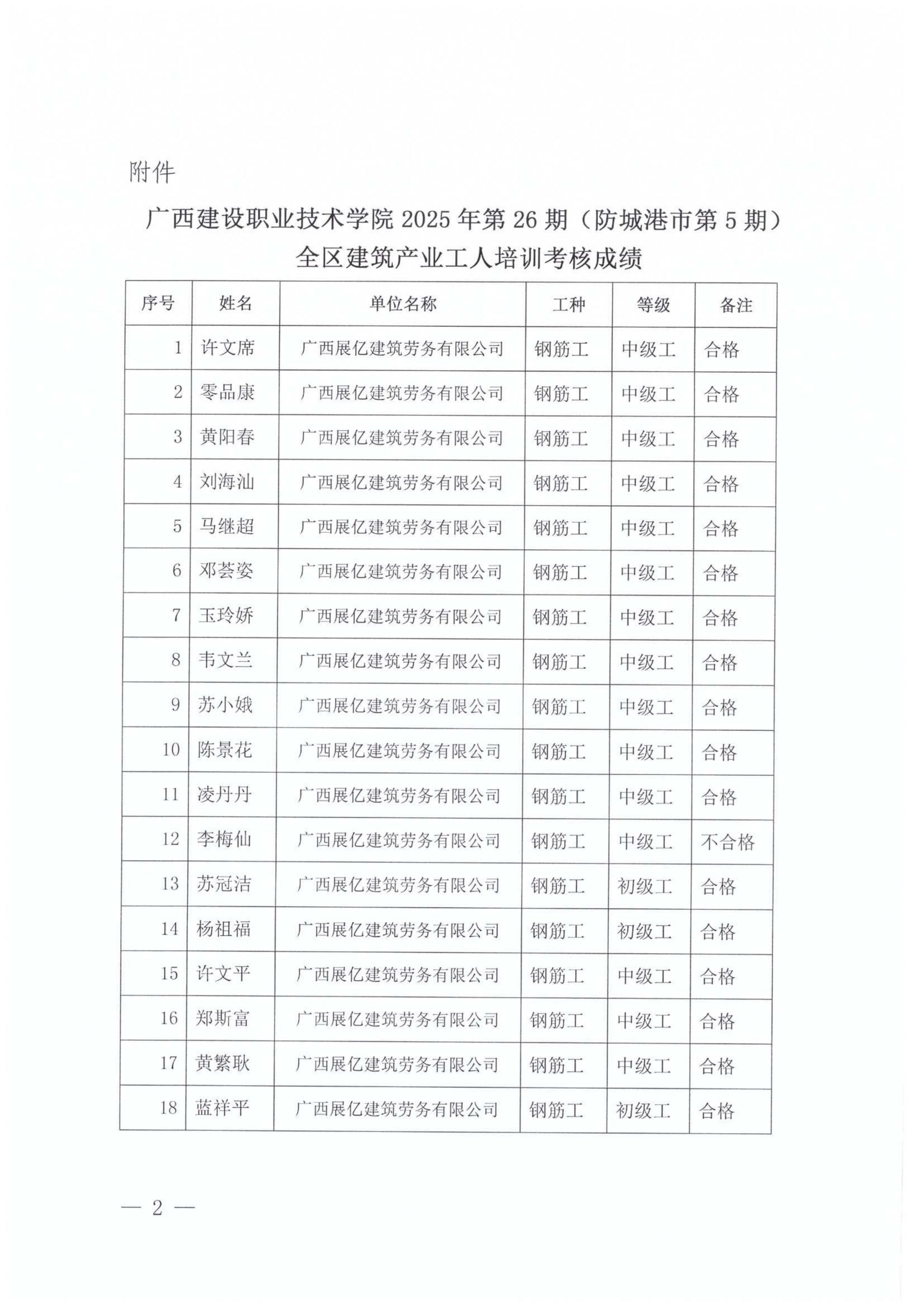 关于伟德国际1946源于英国2025年全区建筑产业工人第26期(防城港市第5期)培训考核成绩的公示
