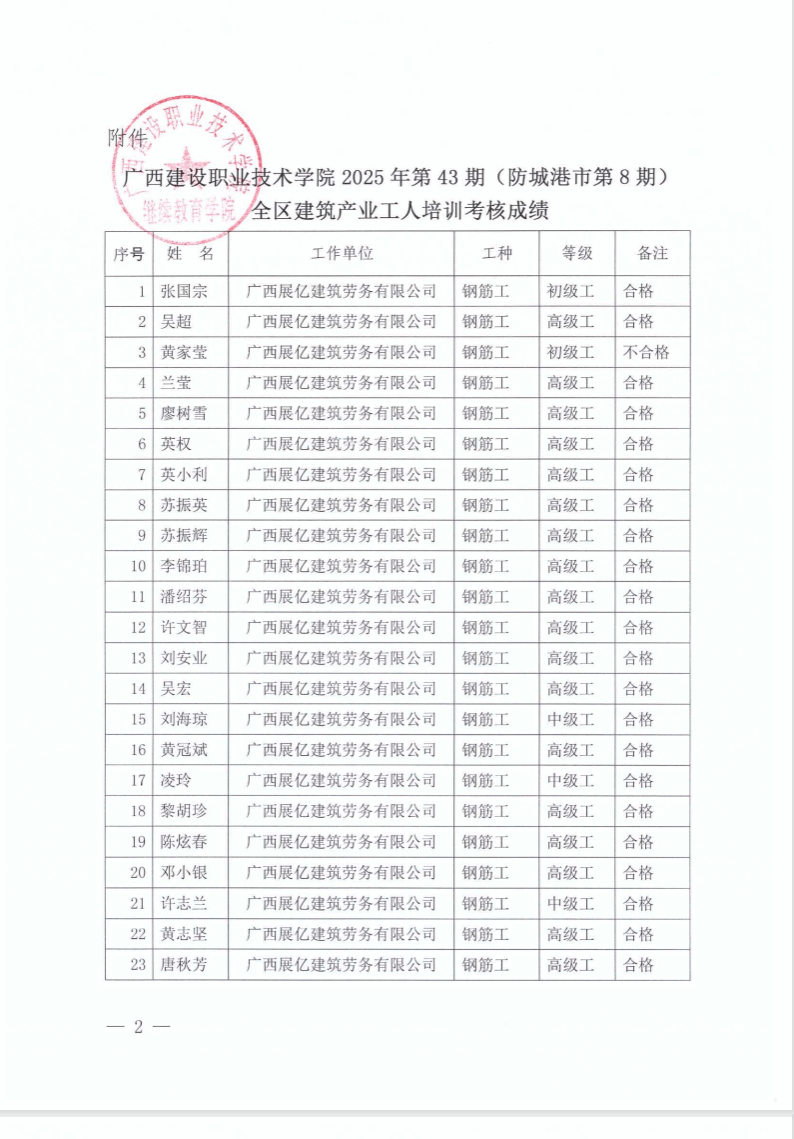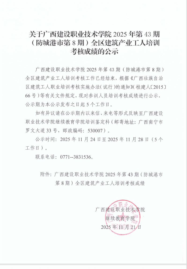 培训信息 当前位置: 首页 >> 培训信息 >> 正文 关于伟德国际1946源于英国2025年全区建筑产业工人第43期(防城港市第8期)培训考核成绩的公示 发布日期:2025-11-21 点击: 附件【关于伟德国际1946源于英国2025年全区建筑产业工人第43期(防城港市第8期)培训考核成绩的公示.pdf】已下载次